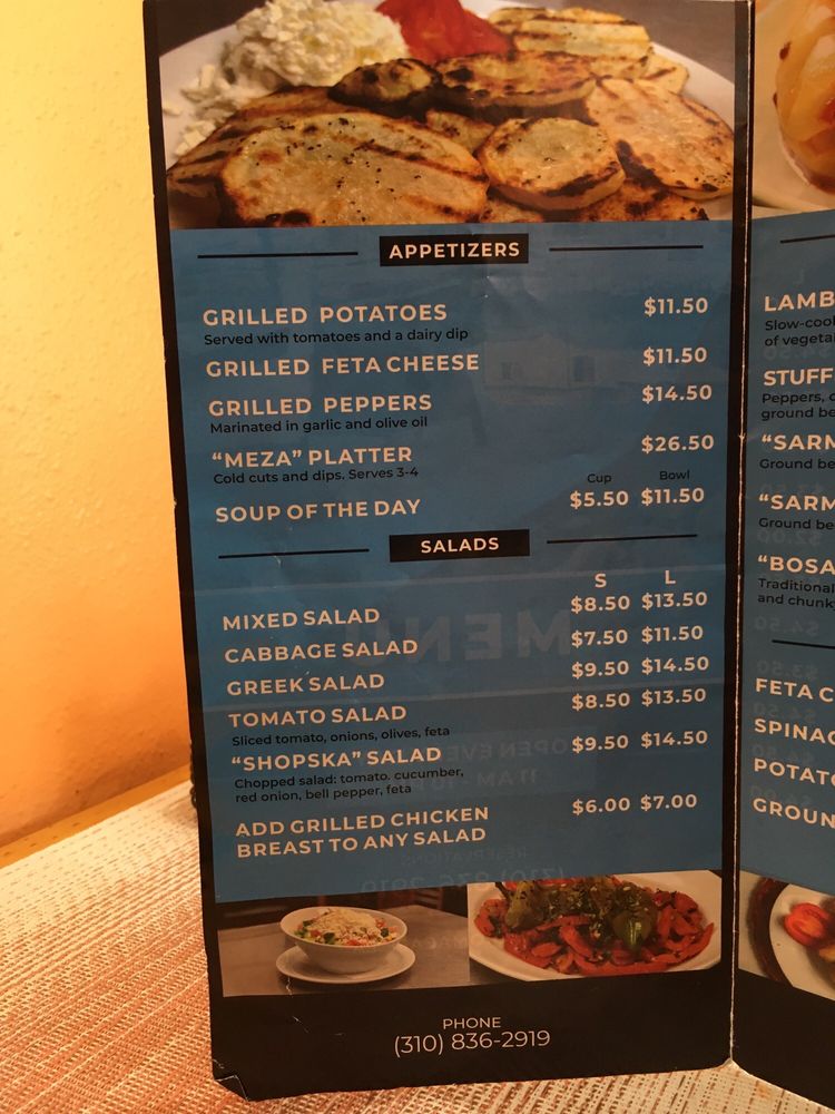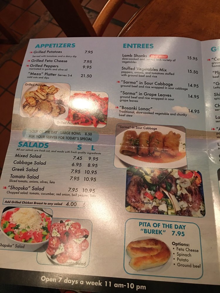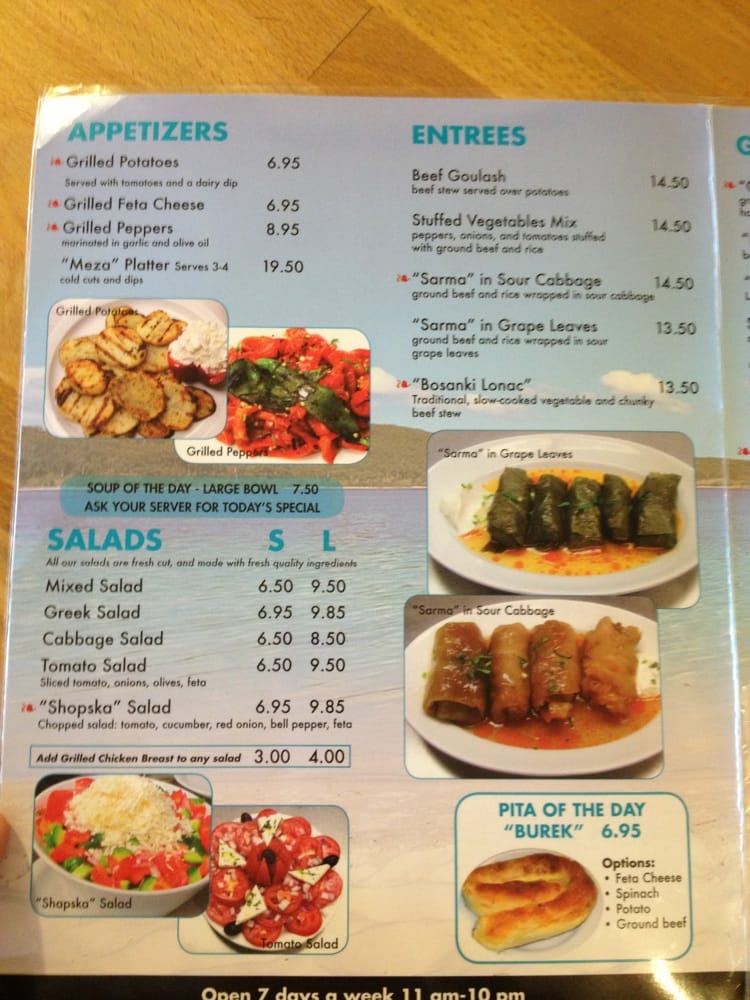 Appetizers such as Grilled Potatoes and the enticing "Meza" Platter serve as a perfect introduction, featuring vibrant flavors and fresh ingredients. The salads, including the classic Greek and refreshing Shopska, offer delightful crunch and zest.